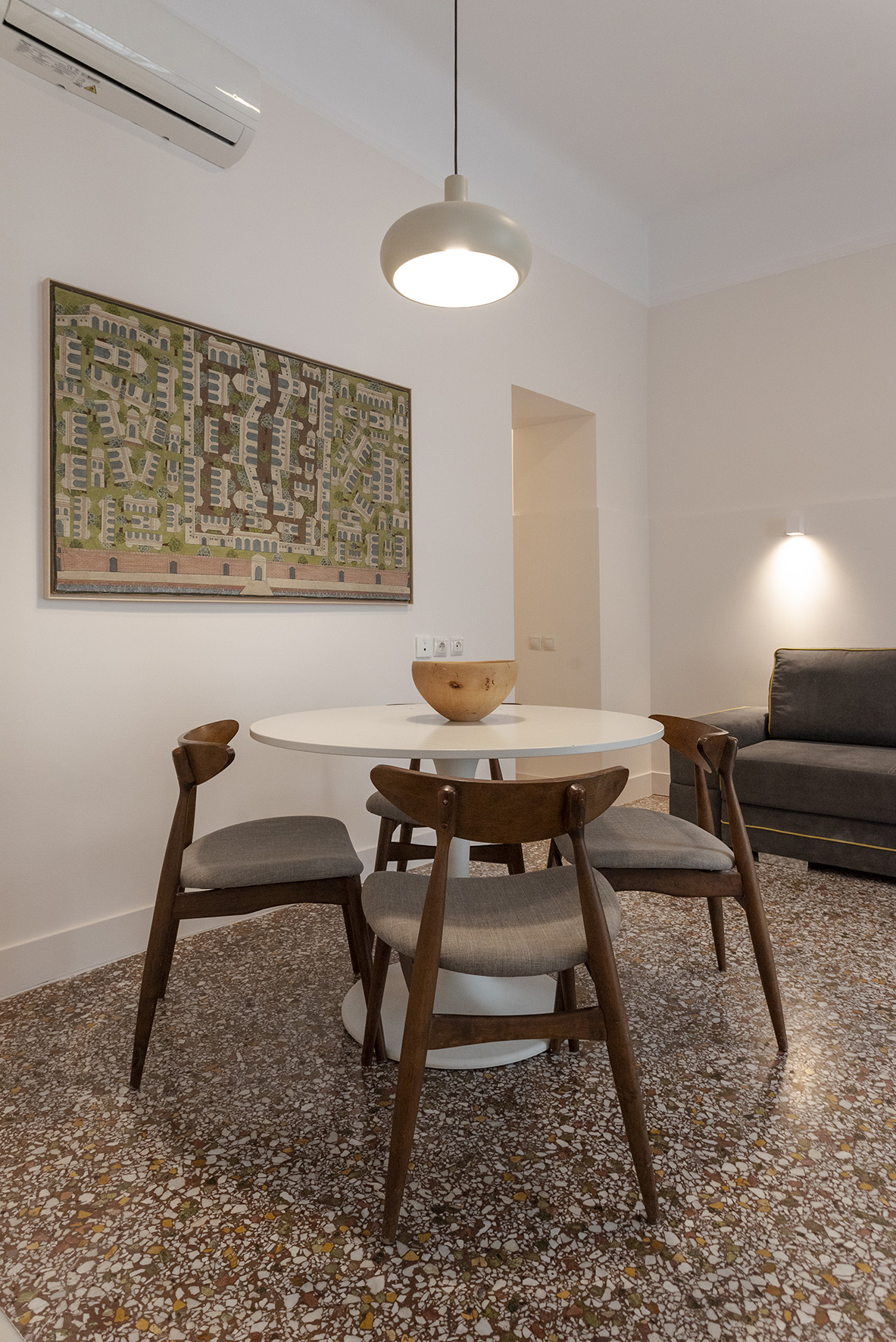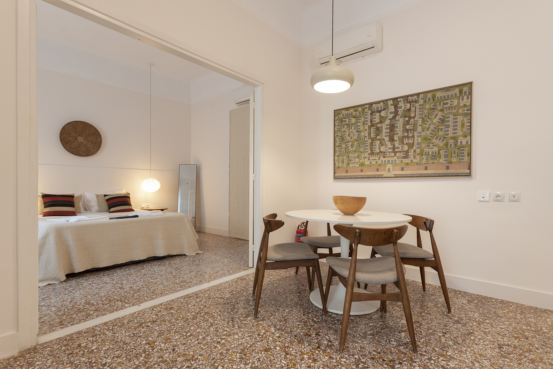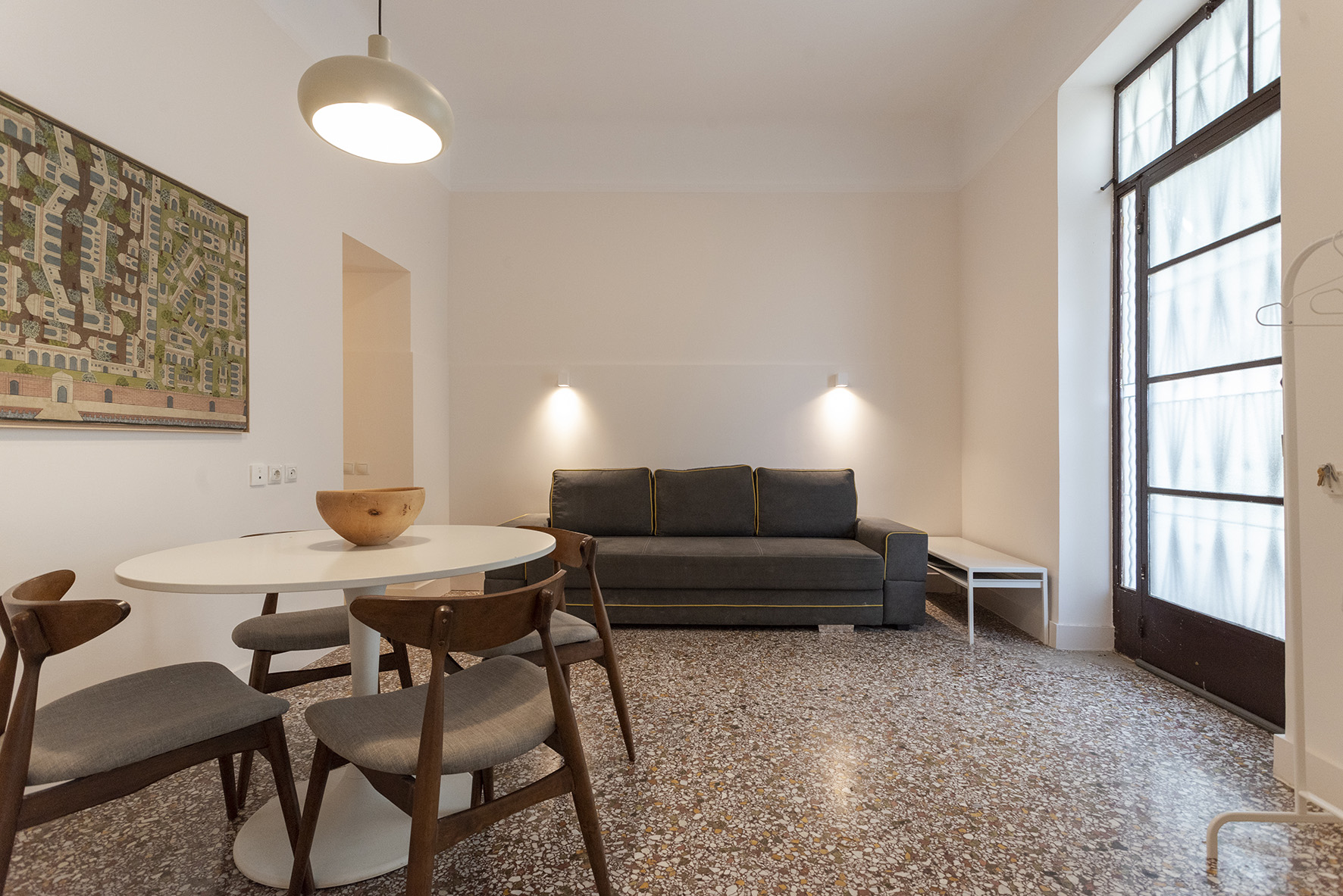 Step into 45 m² of effortless charm — high ceilings, vintage mosaiko floors, and sunlit corners create a space full of character and calm. The open layout flows easily between a cozy sleeping nook and a relaxed seating area, perfect for unwinding after a day in the city.